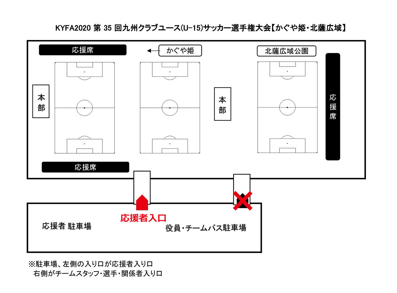 試合開始直前に指定された経路(下記の図をご確認下さい。)にて試合会場に入場、体温計測後に指定されました応援席にて、密を避けた状態でご観戦下さい。